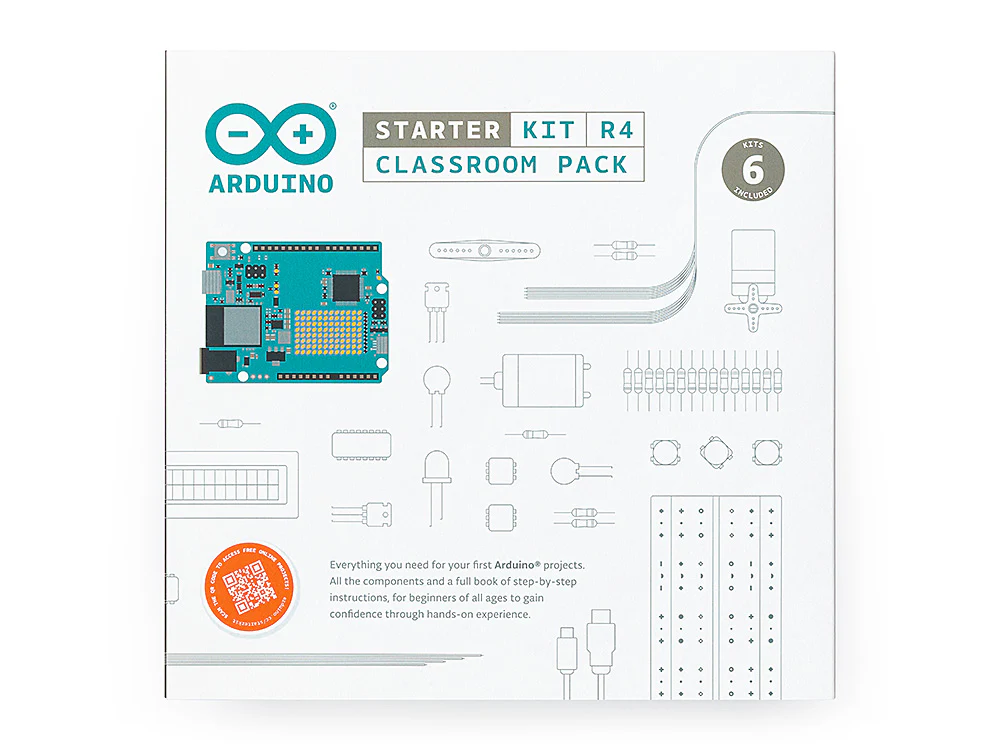 The Arduino Starter Kit R4 Classroom Pack is a bundled solution containing six of Arduino’s newest Starter Kits – perfect to upgrade the STEM experience at school or lead interactive activities at your fablab or makerspace. It is ideal for any group of at least 12 people (we recommend two students per kit), from middle school / 6th grade onwards.Â